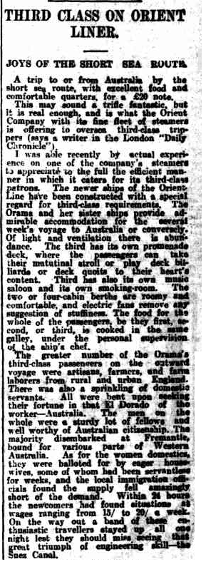 Being a third class passenger on the RMS Orama would have been quite a comfortable experience. The Adelaide Advertiser ran an article on 8 May 1914 describing the accommodations of the third class passengers. I have included the first half of the article. The rest of the article not shown below describes a fairly dramatic incident where a third class passenger took a header over the side. The article states the event was certainly not on the sports programme, but it might have been, to judge by the promptitude with which the victim of his own folly was rescued from death. According to the article contact with the water had cooled the mans heated brain15, the RMS Orama stopped, and the passengers cheered on two rescue boats as they tried to reach the man. If you want to know how it all turned out, you will need to read the full article in Trove.